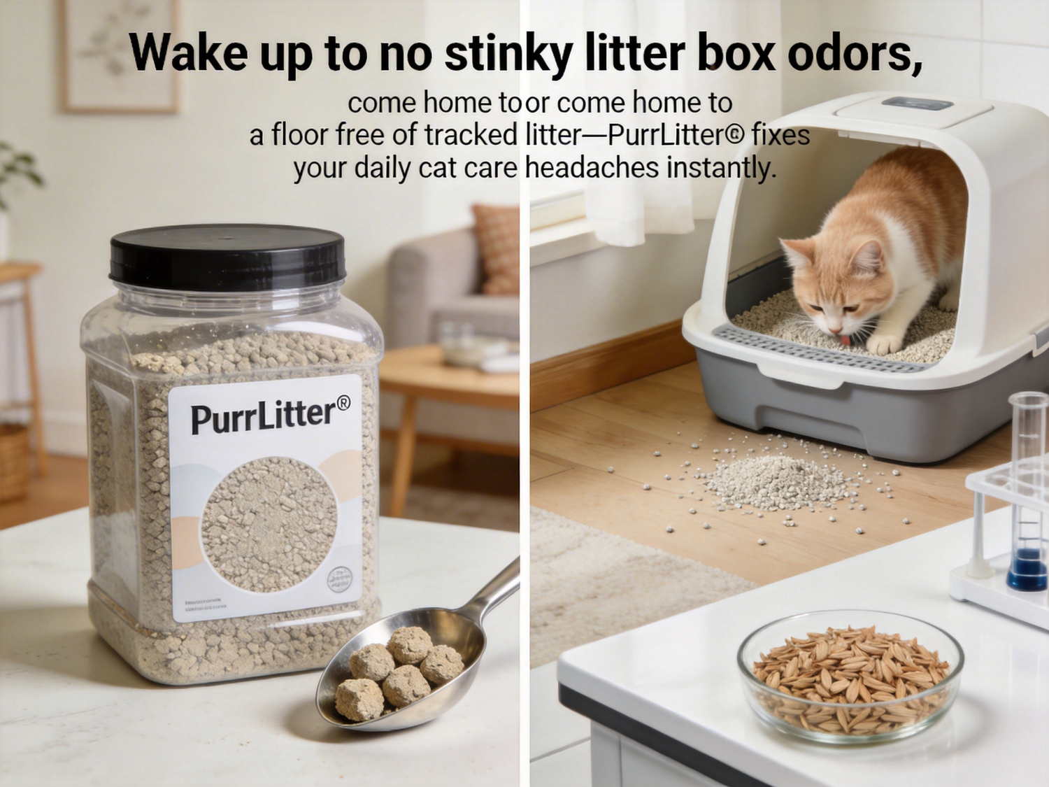 Wake up to no stinky litter box odors, or come home to a floor free of tracked litter—PurrLitter® fixes your daily cat care headaches instantly. The moment your cat finishes, our ultra-absorbent plant-based clumping formula locks in moisture and neutralizes odors in 10 seconds flat, so you never have to hold your breath while scooping. No sticky residue caking the box bottom, no fine dust irritating your cat’s nose or your lungs. Perfect for busy mornings when you’re rushing out, impromptu guest visits, or lazy evenings with your feline pal—just a quick scoop, and your space stays fresh, clean, and purr-fect for both you and your cat.