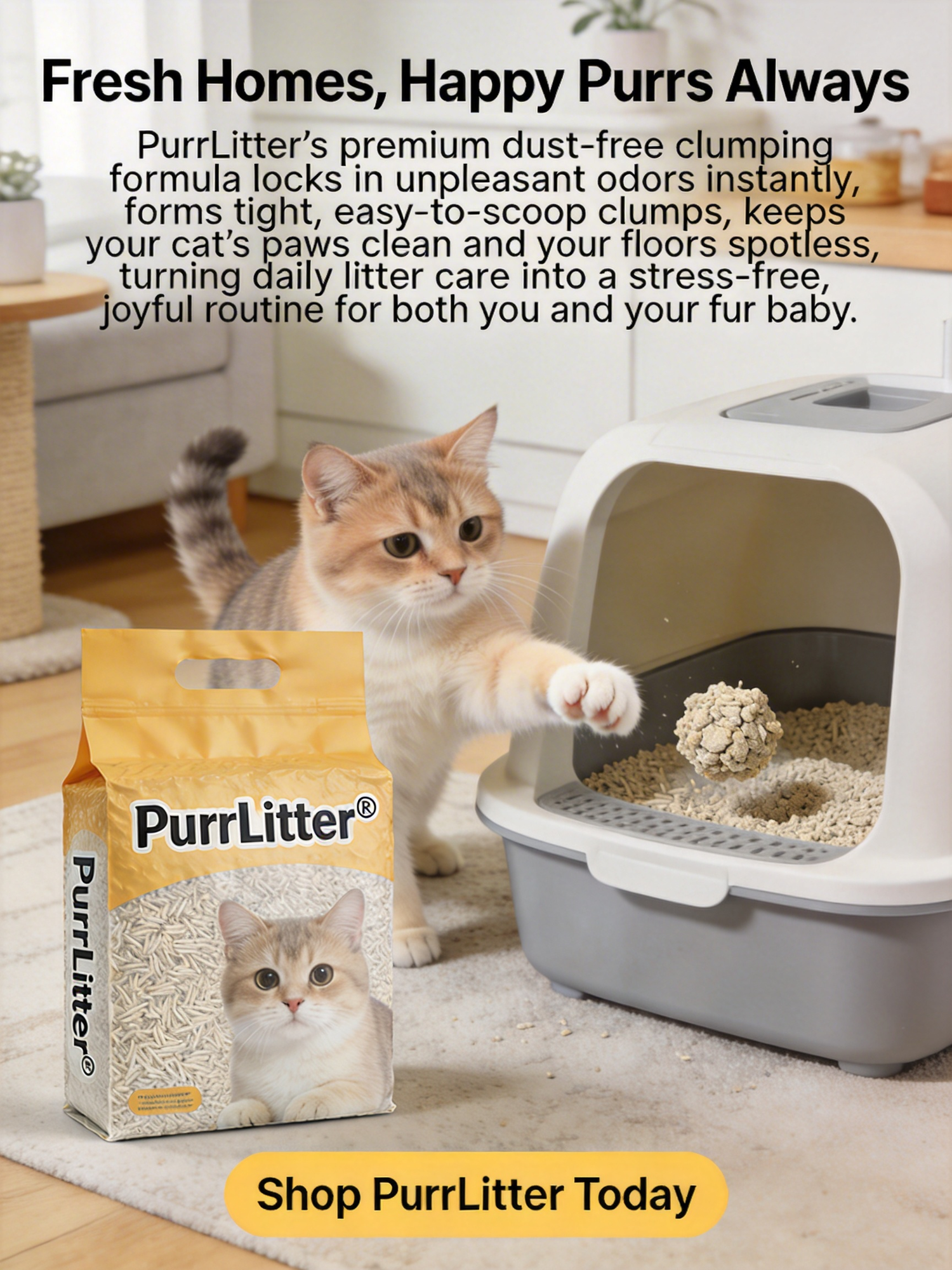 PurrLitter’s premium dust-free clumping formula locks in unpleasant odors instantly, forms tight, easy-to-scoop clumps, keeps your cat’s paws clean and your floors spotless, turning daily litter care into a stress-free, joyful routine for both you and your fur baby.Shop PurrLitter Today